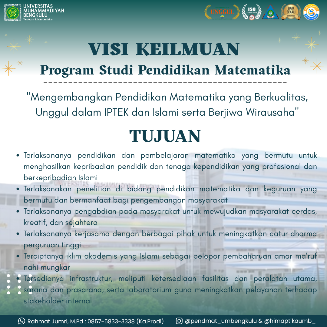 Selamat datang di website Program Studi Pendidikan Matematika Universitas Muhammadiyah Bengkulu! Pada 11-22 September 2023 mahasiswa Program Studi Pendidikan Matematika Universitas Muhammadiyah Bengkulu melaksanakan kegiatan study tour ke Jakarta, Bromo,…